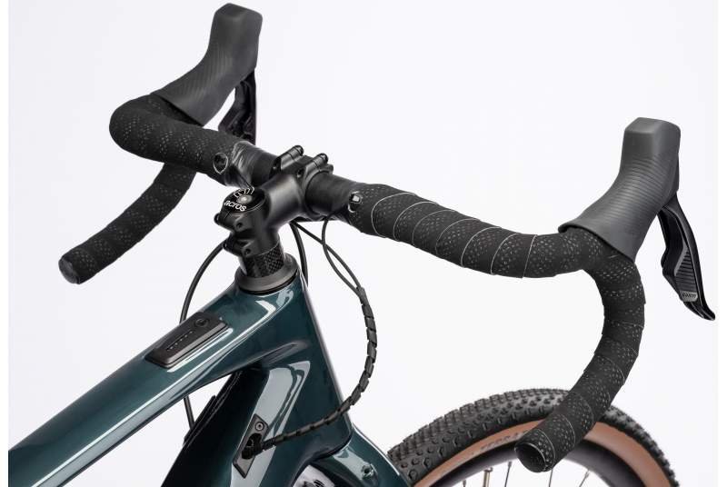 Por otro lado, el cuadro de la e-gravel está hecho de carbono, lo que le da una estructura ligera y resistente. Este material no solo reduce el peso de la bicicleta, sino que también va a mejorar la transferencia de energía de cada pedalada, lo que se traduce en mayor velocidad y control. Además, el diseño de este cuadro está pensado para la geometría gravel, lo que le confiere una gran estabilidad en terrenos irregulares y una absorción de vibraciones extraordinaria. Con una geometría optimizada que incluye un ángulo de tubo de dirección de 69.8 a 70.5 grados y un alcance de hasta 443 mm, la bicicleta te proporciona una conducción muy cómoda y controlada,, tanto en senderos estrechos como en las carreteras más abiertas.