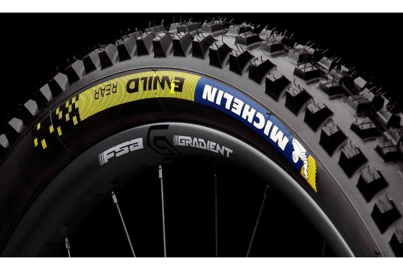 Por otro lado, las ruedas y cubiertas han sido elegidas para flotar sobre cualquier terreno. Con un juego de ruedas FSA Gradient l30 Carbon MS, el comportamiento en senderos es pura poesía. Su construcción en carbono, su ancho interno de 30 mm y su rigidez torsional garantizan aceleraciones fulminantes y una tracción muy estable. Las acompaña el agresivo agarre de las cubiertas Michelin E-Wild Racing Line 29×2.6″, que se adaptan al terreno como una garra, garantizando confianza tanto en terreno seco como en mojado.