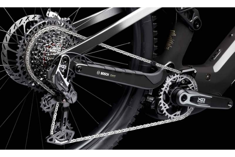 La transmisión eléctrica es uno de los puntos fuertes de esta bicicleta. Está equipada con lo mejor de SRAM ya que la e-MTB está equipada con el sistema X0 AXS Eagle T-Type, con cambio y cadena X0, cassette XS-1275 y bielas X0 e-MTB de 170 mm con plato de 34T. La combinación de la tecnología electrónica e inalámbrica AXS, junto con la robustez del ecosistema T-TYpe, va a permitir que tengas cambios limpios, precisos y ultra rápidos incluso bajo carga. Los pulsadores AXS Pod Ultimate ofrecen una ergonomía sobresaliente, personalizable y lista para competir.