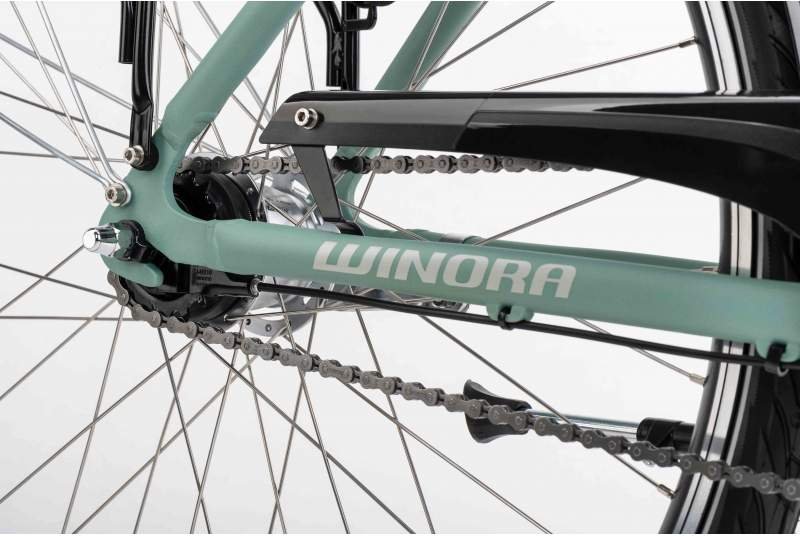 Y pensando en tu día a día, la bicicleta viene completamente equipada con un portabultos trasero StandWell CS051 con capacidad de carga de hasta 25 kg, ideal para alforjas o cesta. También incluye guardabarros delanteros y traseros Winora Chromoplastic, una pata de cabra lateral de aluminio y llantas huecas Winora X3 con radios de acero inoxidable, preparadas para resistir el uso urbano más exigente.