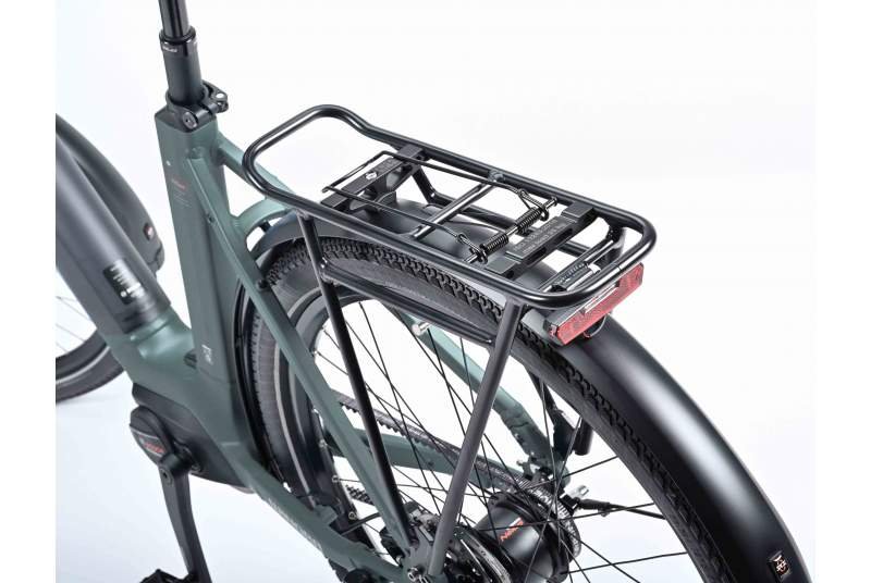 Para completar el conjunto urbano de esta bicicleta y que sea absolutamente perfecto, incluye las luces integradas: en la parte delantera las Herrmans MR5 (6-12V) y en la parte trasera el AXA Juno Ebike, ambos alimentados directamente desde la batería central, asegurando visibilidad en todo momento. También cuenta con un candado de cuadro Abus compatible con el sistema Plus, y es apta para añadir un extensor de autonomía o una silla infantil trasera.