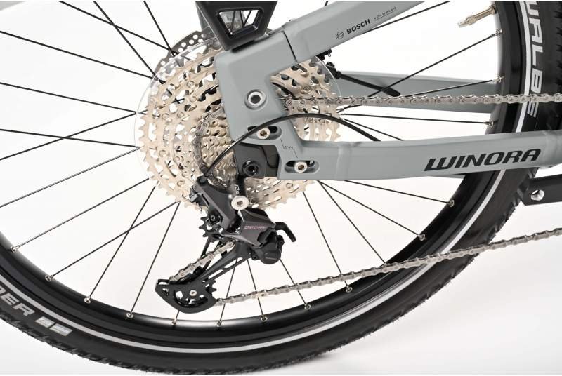 Por otro lado, la Winora cuenta con una transmisión Shimano Deore RD-M6100 de 12 velocidades, permitiéndote elegir entre un rango de marchas que se adaptan a cualquier tipo de terreno, desde subidas empinadas hasta largos descensos. El cassette Shimano CS-M6100-12 con un rango de 10-51T asegura que puedas tener la marcha perfecta para cada situación que se genere en tu camino.