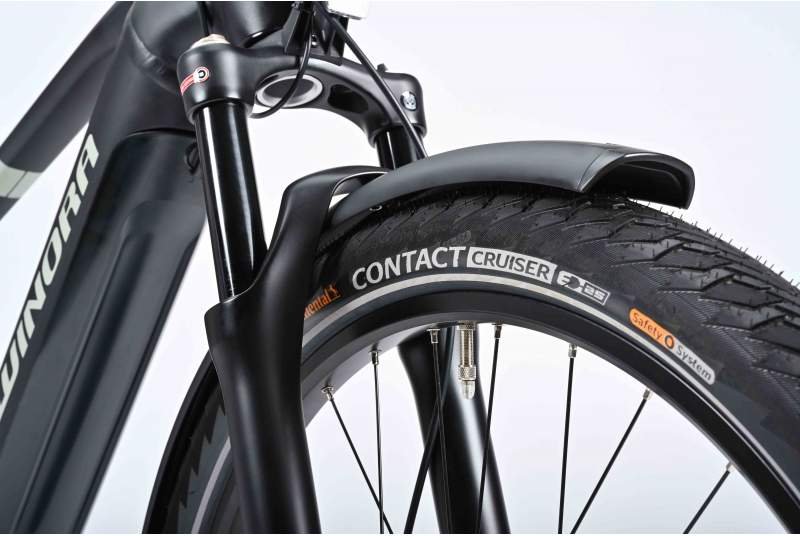La iluminación integrada con luces Herrmans MR5 delante y Spanninga Aerline 2.0 con luz de freno trasera, junto con el sistema de bloqueo Abus Plus System, añade seguridad extra para tus desplazamientos en ciudad y carretera.